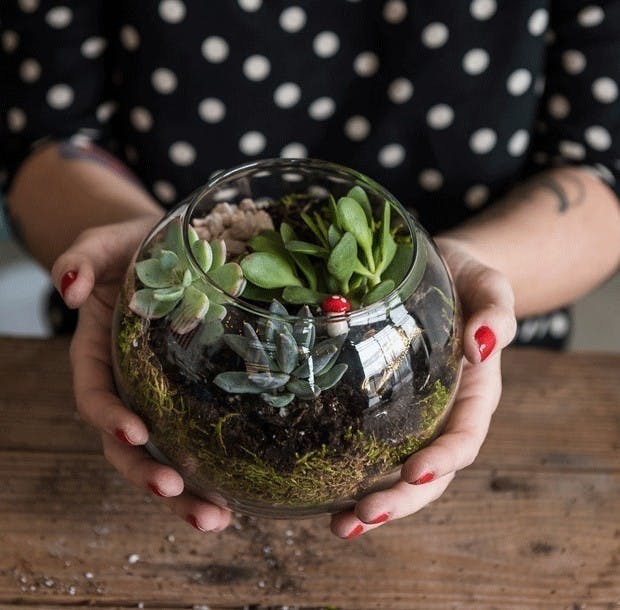 We'll be filling glass bubble bowls with rocks, foraged moss, hearty succulents and a few other surprises!